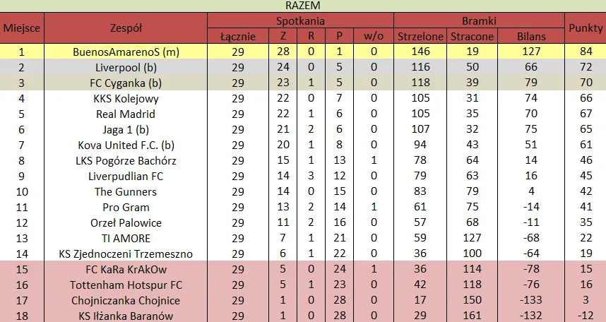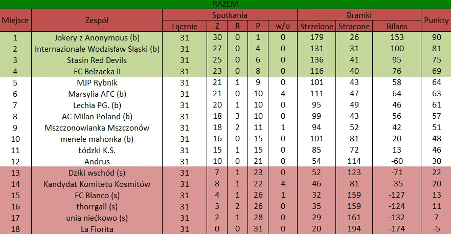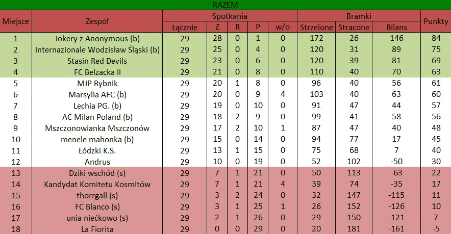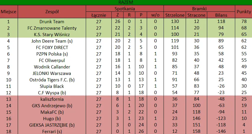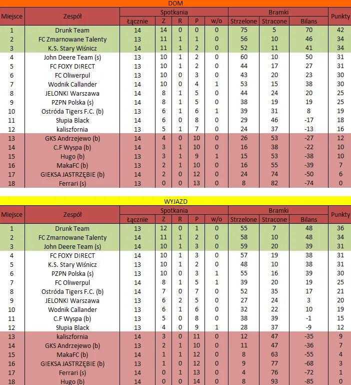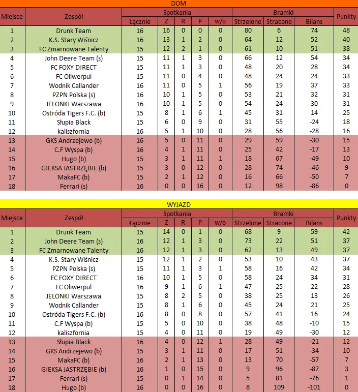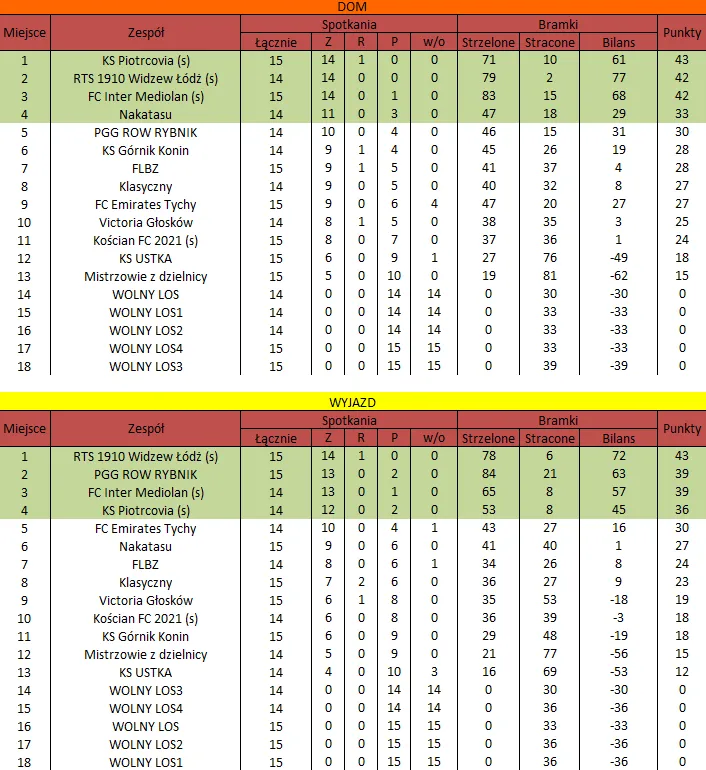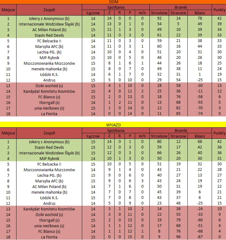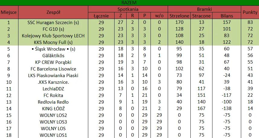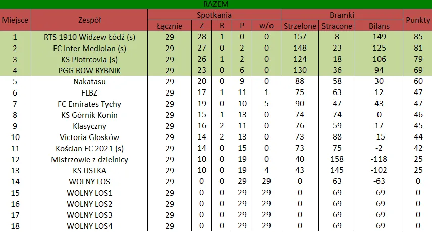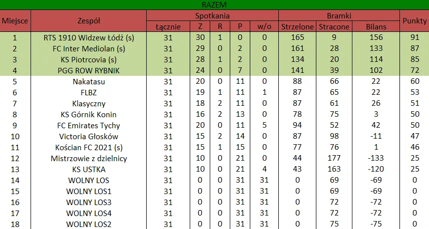 WOLNY LOS4 0 : 3 FLBZDrużyny z minusowo punktowym startem: FC Emirates Tychy (-10), KS USTKA (-5), FLBZ (-5), Mistrzowie z dzielnicy (-5), Klasyczny (-5).